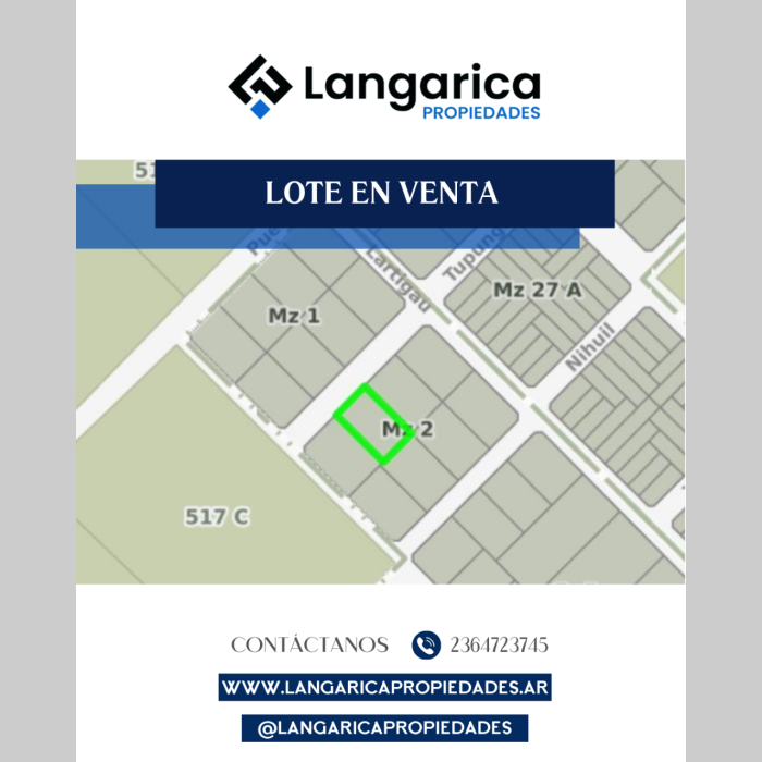 Lote de 224 m2 en esquina (Aprox. 9,63 m x 23,74 m). Servicios: Agua, cloacas y electricidad. Próximamente iluminación pública. Calle de tierra.